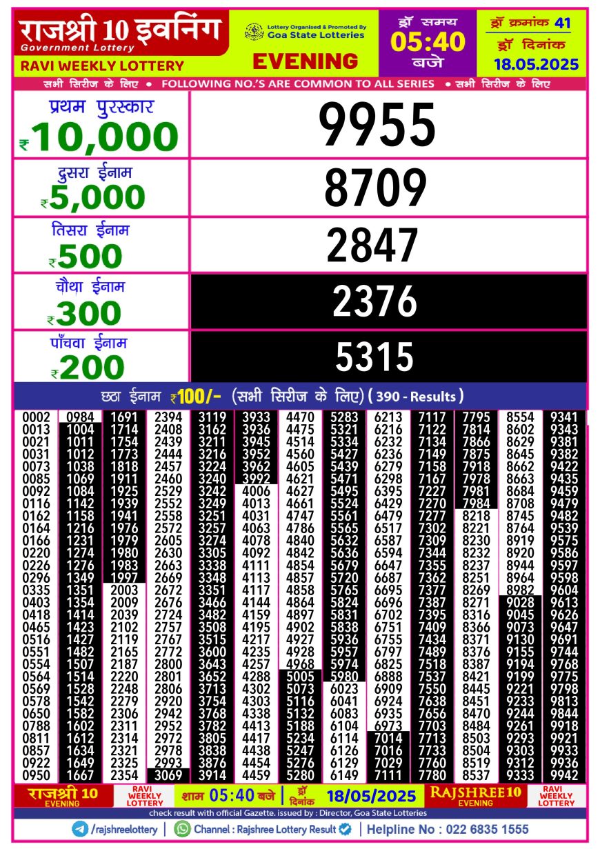 Rajshree 10 Daily Lottery 5.40 Pm Result 18.05.2025 May 18, 2025 Leave a comment Related Results Rajshree Daily Lottery 4 Pm Result 3.06.2025 Golden Star Daily Lottery 9 Pm Result 22.05.2025 Rajshree 10 Daily Lottery 5.40 PM Result 01.05.2025