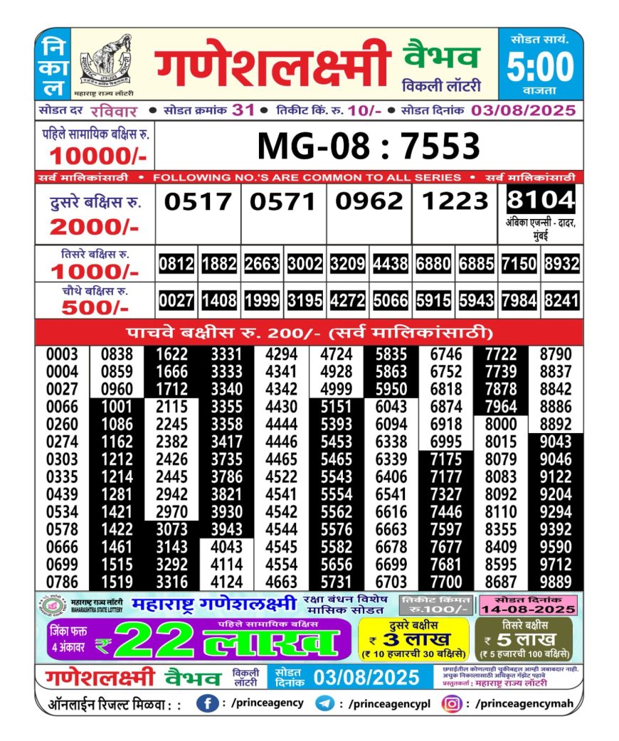 Maharashtra Ganeshlaxmi Weekly Lottery 5PM Result 03.08.2025