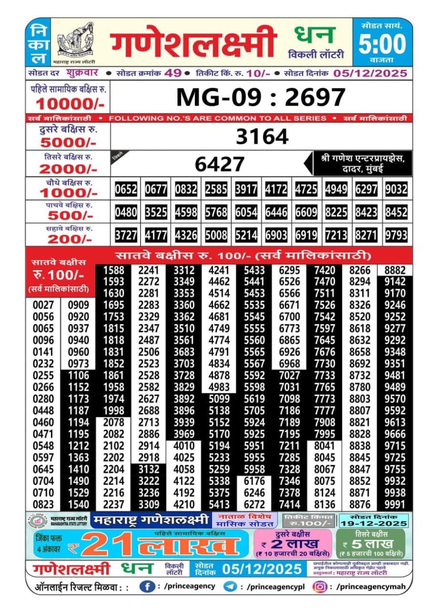 Maharashtra Ganeshlaxmi Weekly Lottery 5PM Result 05.12.2025