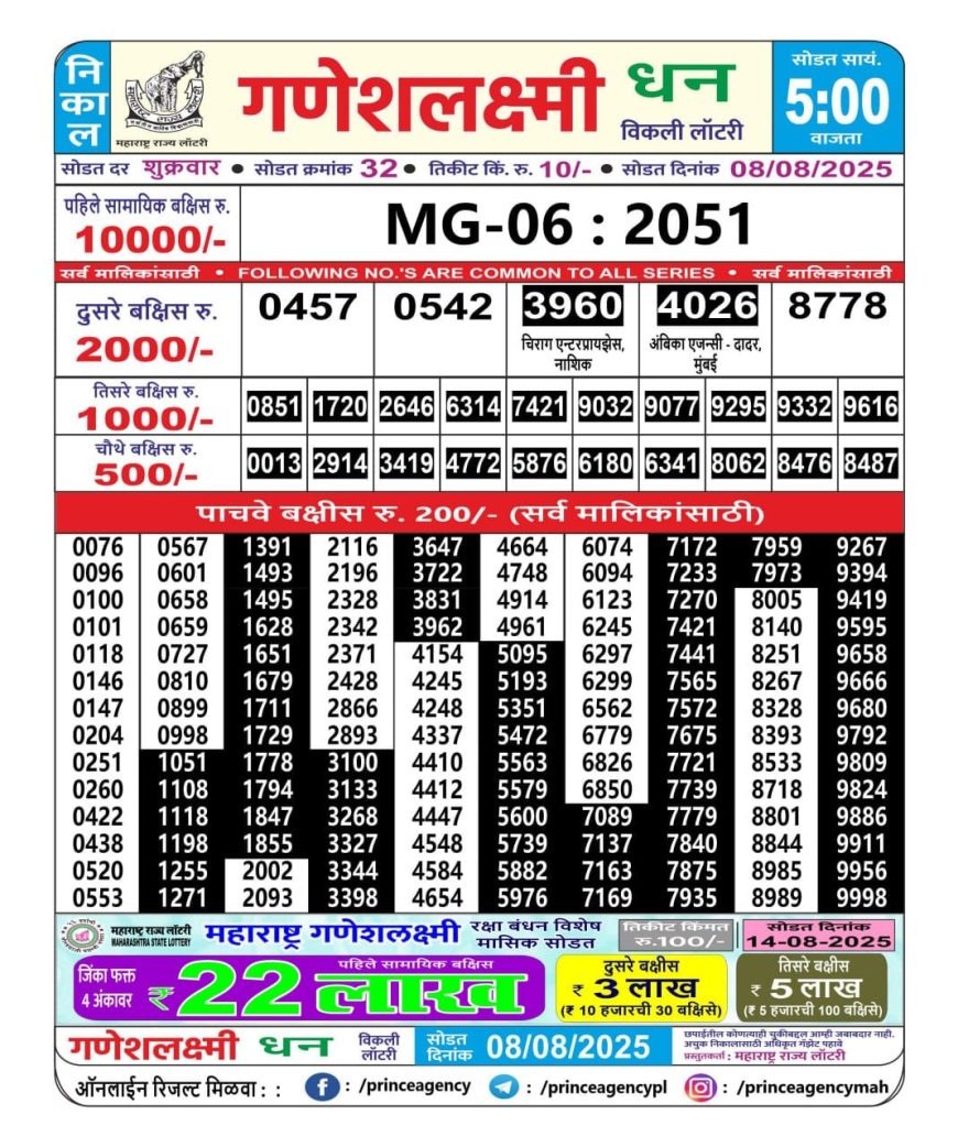 Maharashtra Ganeshlaxmi Weekly Lottery 5PM Result 08.08.2025 August 8, 2025 Leave a comment Related Results Dear Super Daily Lottery 7 PM Result 06.07.2025 Rajshree Daily Lottery 1 PM Result 06.07.2025 Rajshree 10 Daily Lottery 5.40 PM Result 10.07.2025
