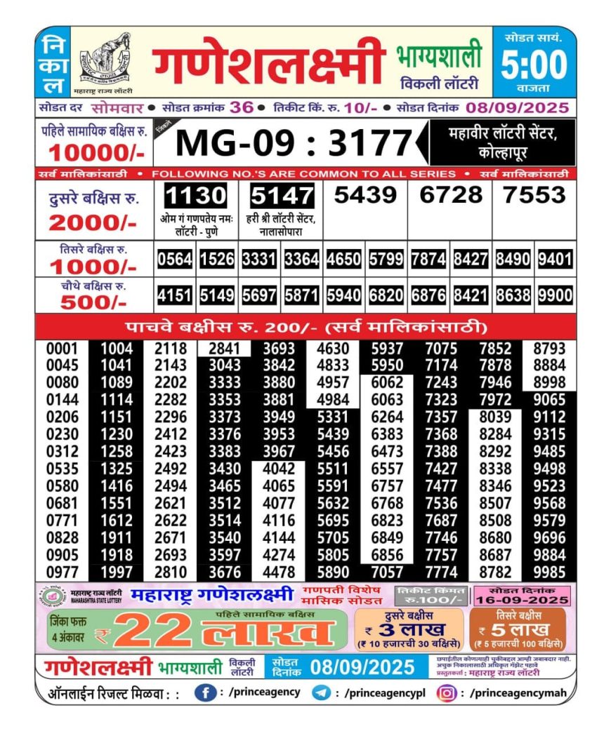 Maharashtra Ganeshlaxmi Weekly Lottery 5PM Result 08.09.2025