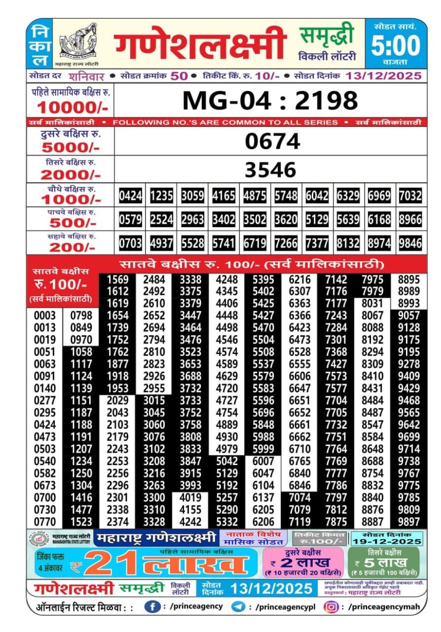 Maharashtra Ganeshlaxmi Weekly Lottery 5PM Result 13.12.2025