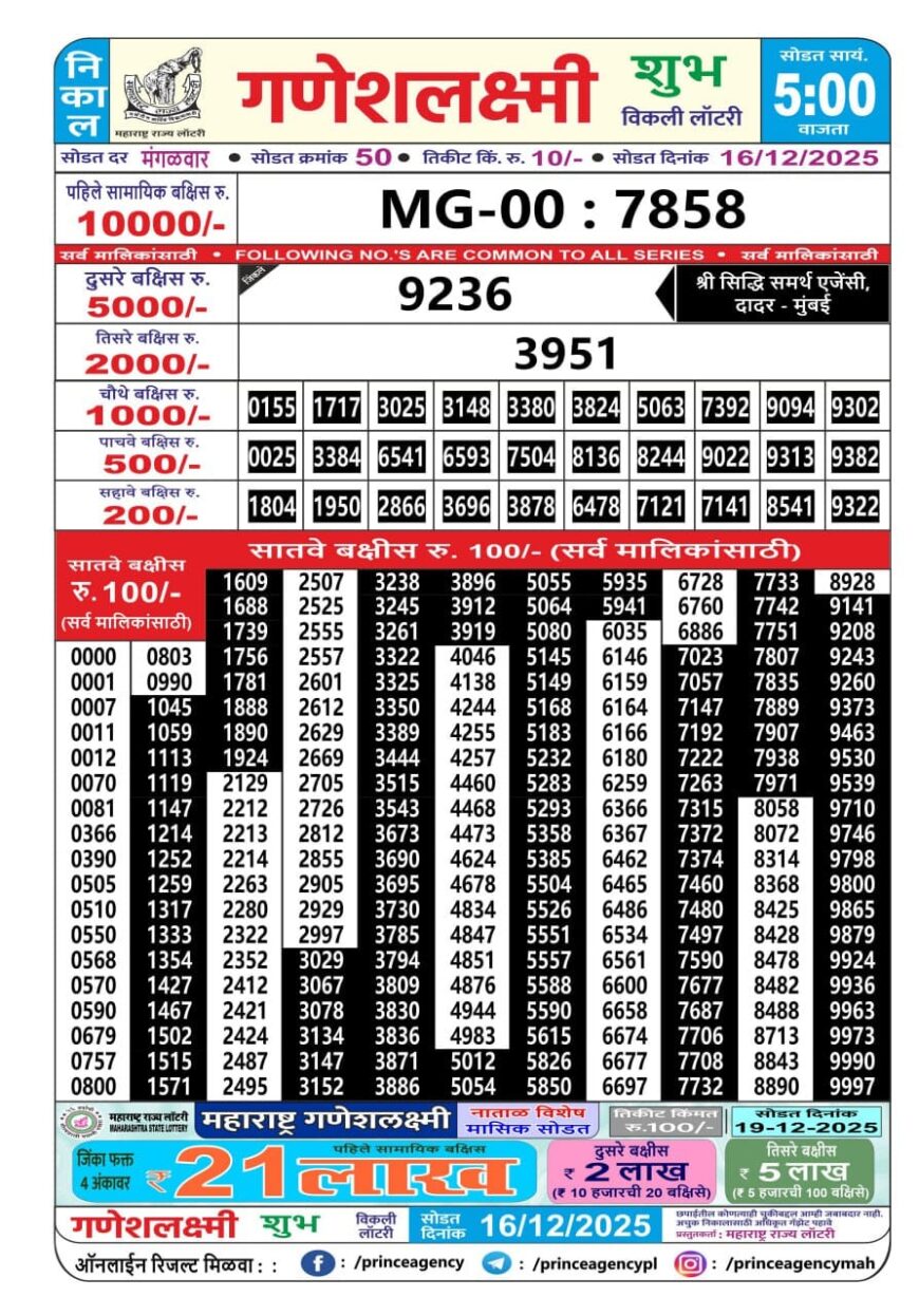 Maharashtra Ganeshlaxmi Weekly Lottery 5PM Result 16.12.2025