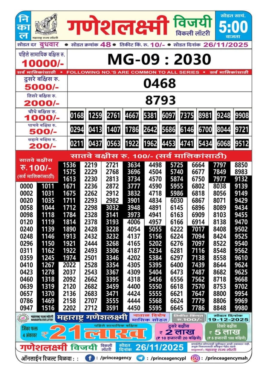 Maharashtra Ganeshlaxmi Weekly Lottery 5PM Result 26.11.2025