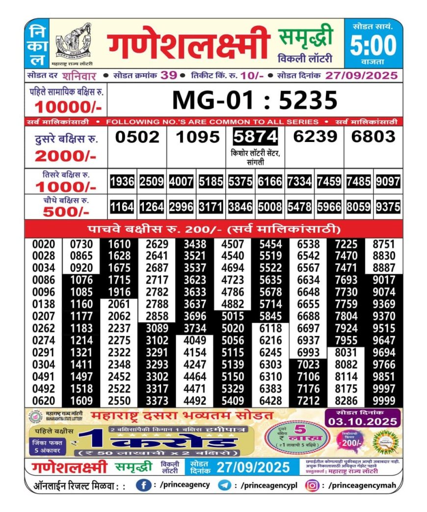 Maharashtra Ganeshlaxmi Weekly Lottery 5PM Result 27.09.2025