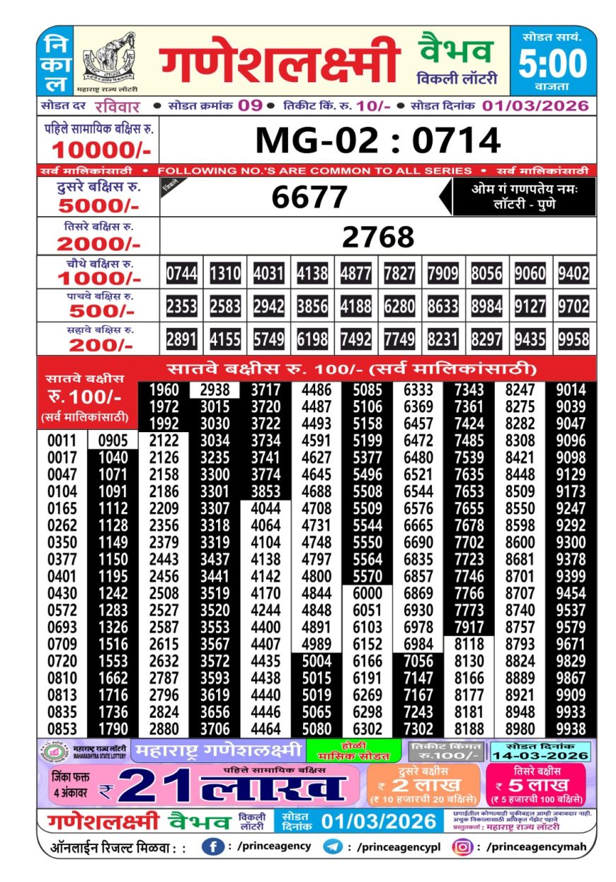 Maharashtra Ganeshlaxmi Weekly Lottery Result 01.03.2026 March 1, 2026 Leave a comment Related Results Rajshree Daily Lottery 8 PM Result 06.05.2025 Labh Laxmi Daily Lottery 4 PM Result 14.07.2025 Dear Daily Lottery 8 Pm Result 6.06.2025