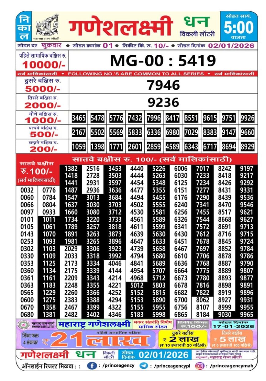 Maharashtra Ganeshlaxmi Weekly Lottery Result 02.01.2026