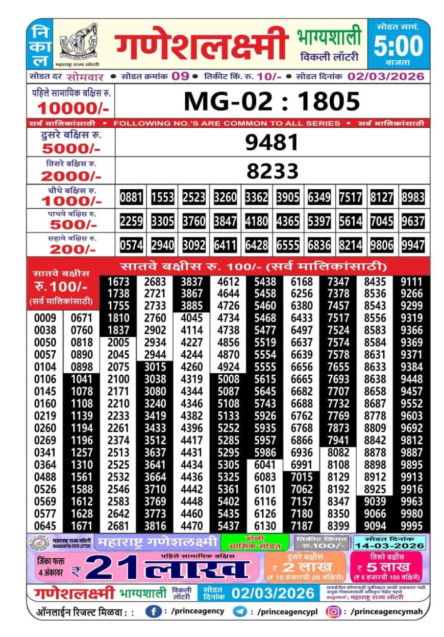 Maharashtra Ganeshlaxmi Weekly Lottery Result 02.03.2026