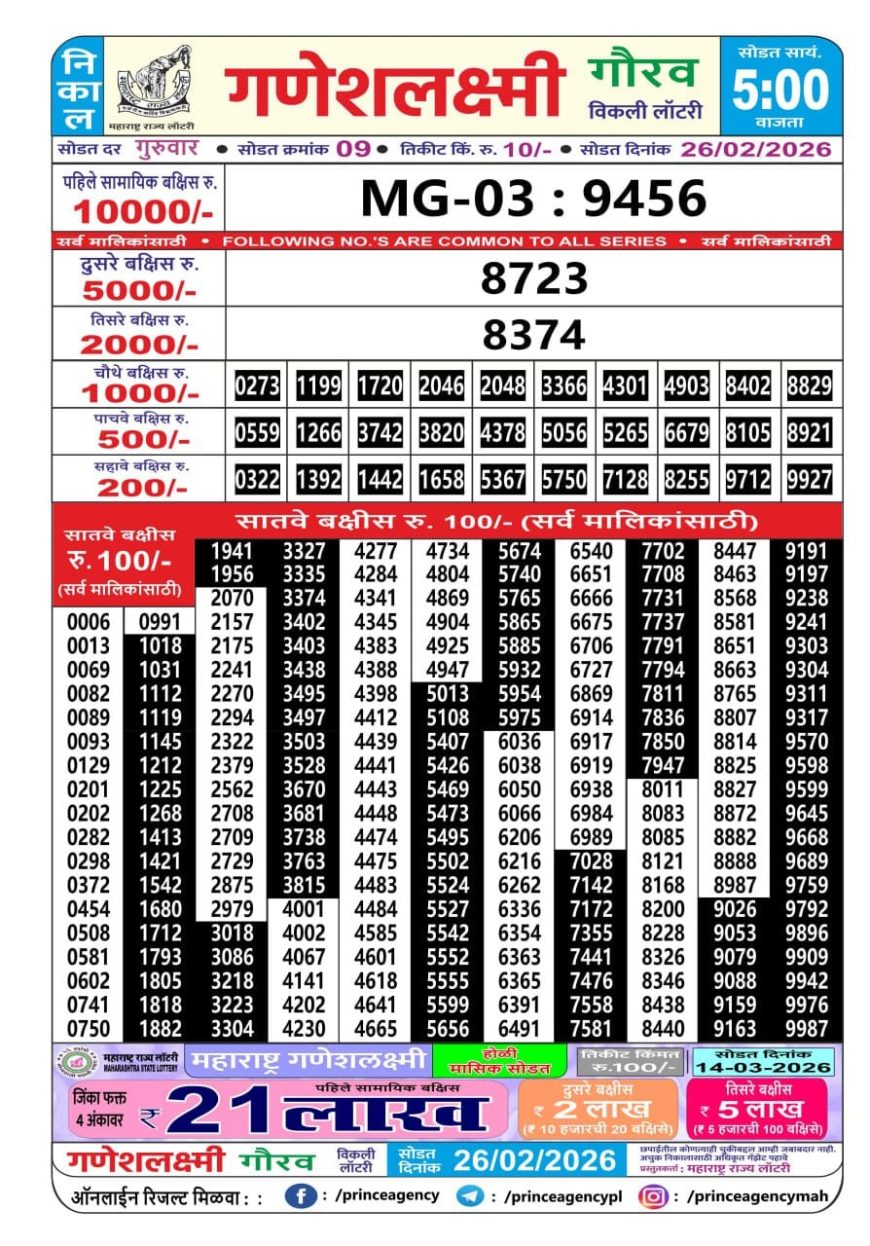 Maharashtra Ganeshlaxmi Weekly Lottery Result 26.02.2026
