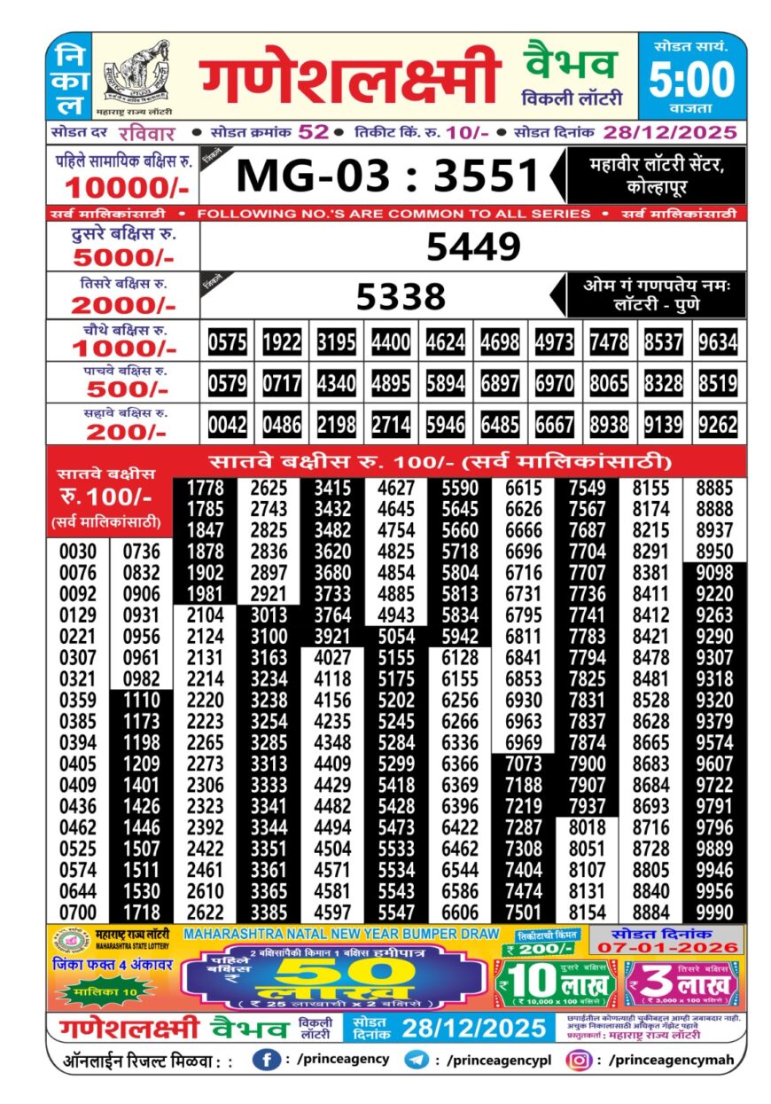 Maharashtra Ganeshlaxmi Weekly Lottery Result 28.12.2025