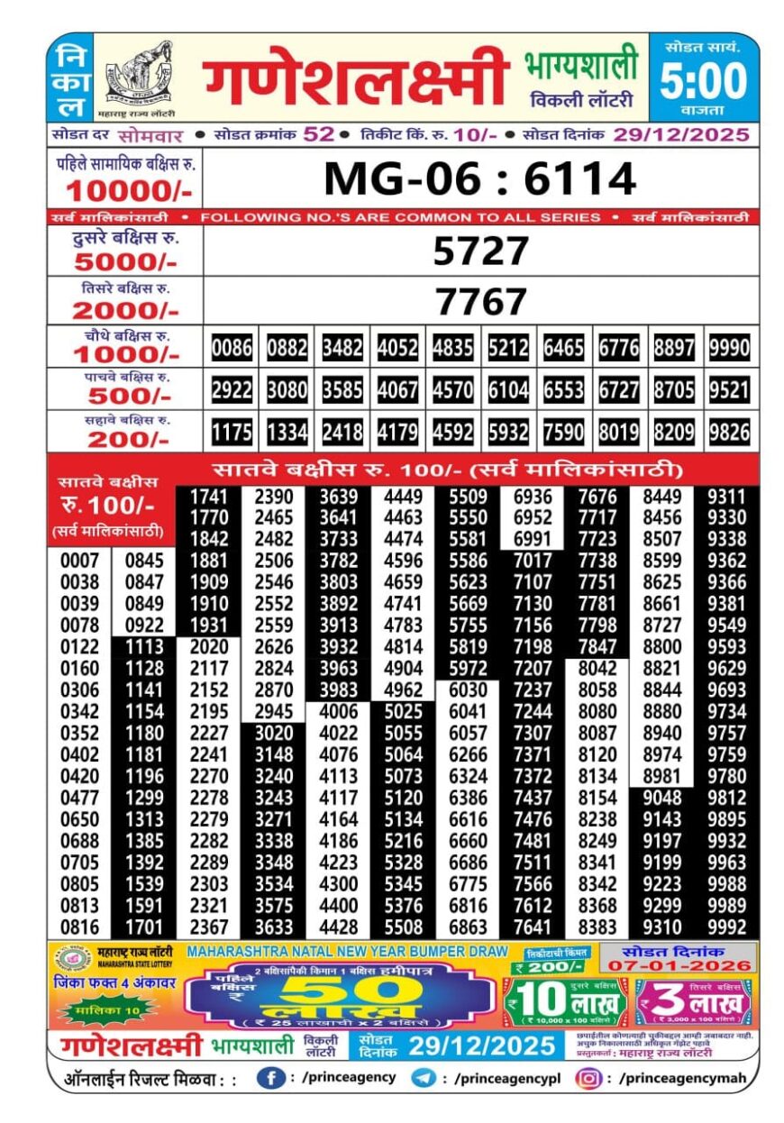 Maharashtra Ganeshlaxmi Weekly Lottery Result 29.12.2025