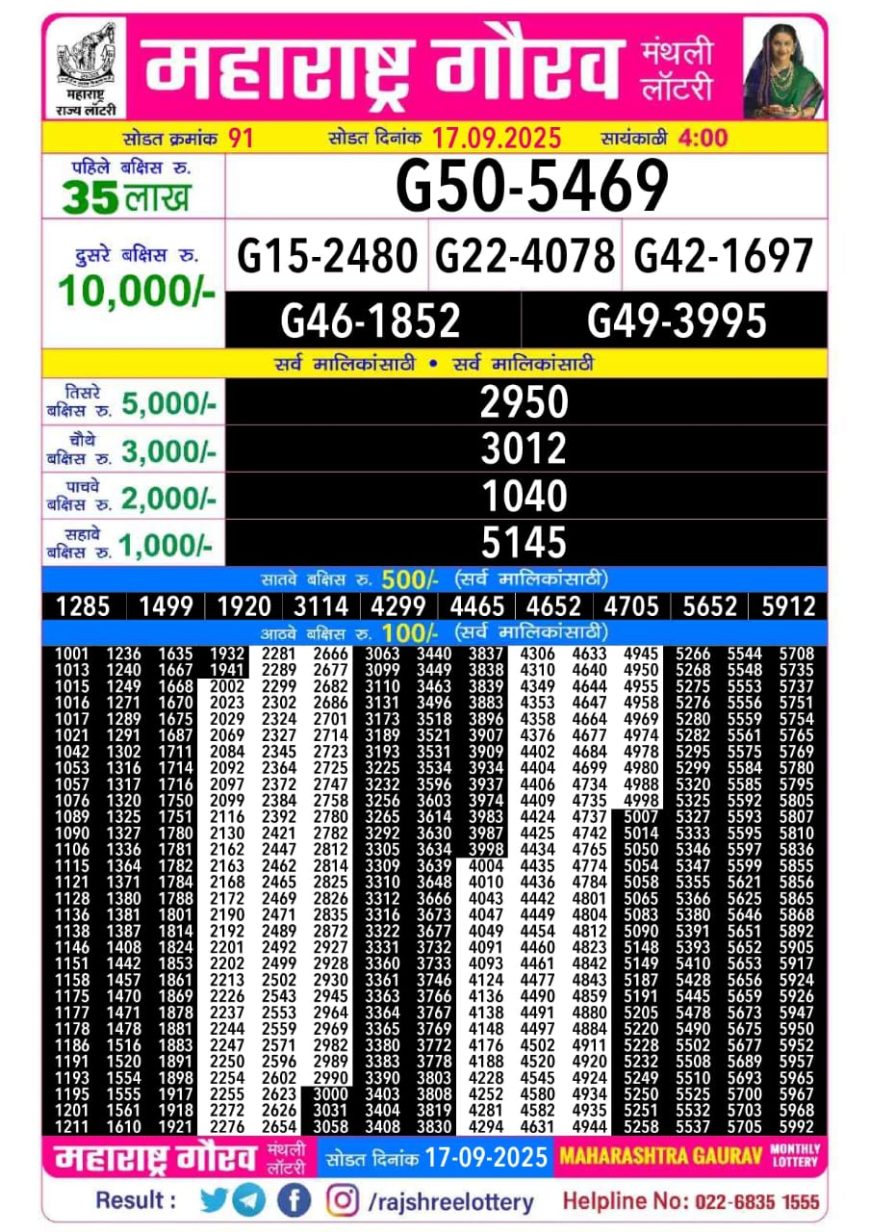 Maharashtra Gaurav Monthly Lottery Result 4.00pm 17/09/2025 September 17, 2025 Leave a comment Related Results Maharashtra Sahyadri Weekly Lottery 4.30PM Result 21.07.2025 Rajshree 50 Daily Lottery 7.30 PM Result 05.05.2025 Maharashtra Sahyadri Weekly Lottery 4.30PM Result 10.09.2025