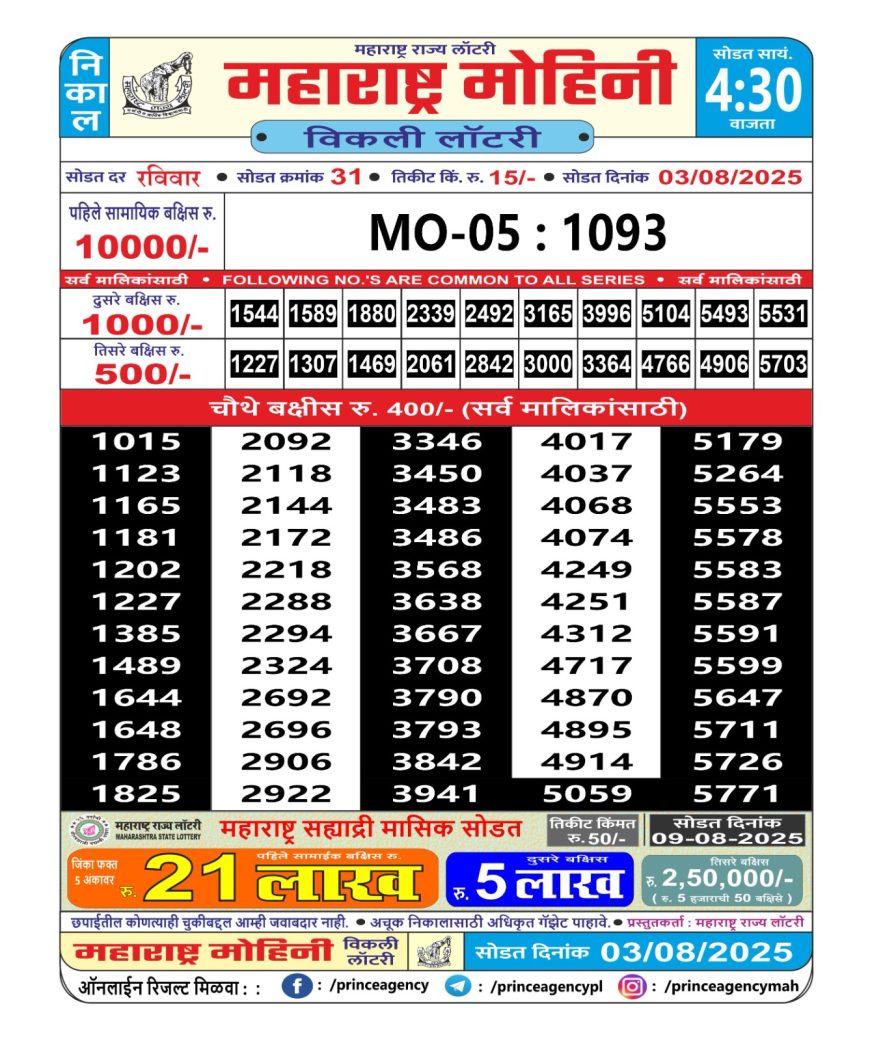 Maharashtra Mohini Weekly Lottery 4.30PM Result 03.08.2025 August 3, 2025 Leave a comment Related Results Rajshree Daily Lottery 8 PM Result 10.05.2025 Punjab State Dear 200 Monthly Lottery Result 05.07.2025 Dear 10 Lottery 1:30 Pm Result 2.06.2025