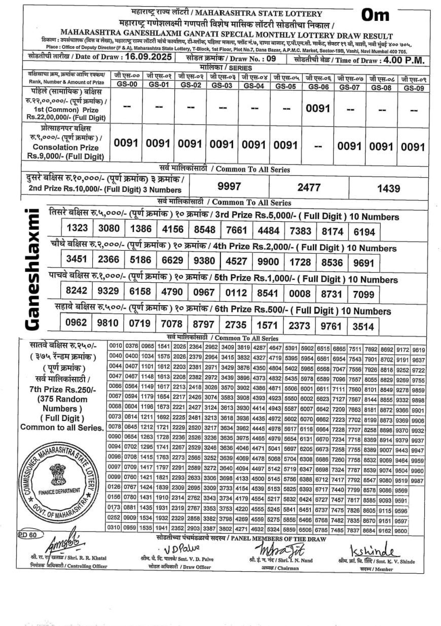 Maharashtra GaneshLaxmi Ganpati Monthly Lottery Result 4.00pm 16.09.2025