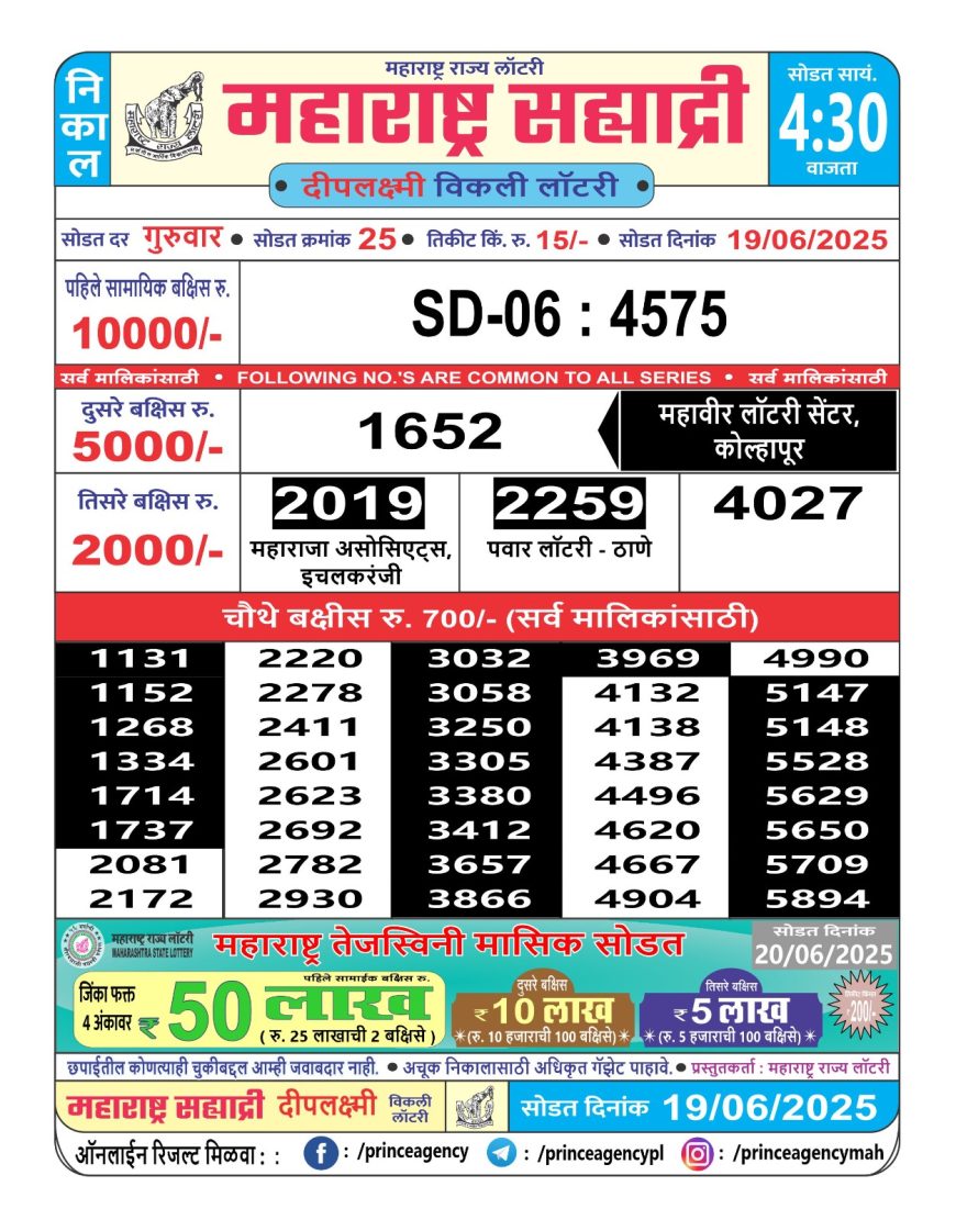 Maharashtra Sahyadri Weekly Lottery 4.30 Pm Result 19.06.2025 June 19, 2025 Leave a comment Related Results Golden Star Daily Lottery 9 PM Result 10.05.2025 Rajshree Daily Lottery 4PM Result 27.08.2025 Maharashtra Gajlaxmi Weekly Lottery 4.45PM Result 08.08.2025