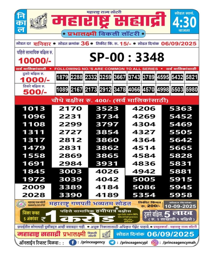 Maharashtra Sahyadri Weekly Lottery 4.30PM Result 06.09.2025