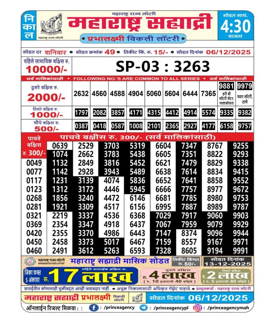 Maharashtra Sahyadri Weekly Lottery 4.30PM Result 06.12.2025