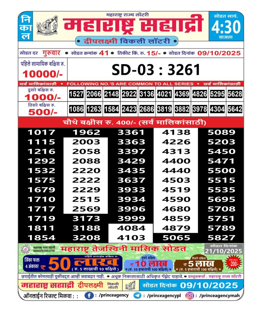 Maharashtra Sahyadri Weekly Lottery 4.30PM Result 09.10.2025