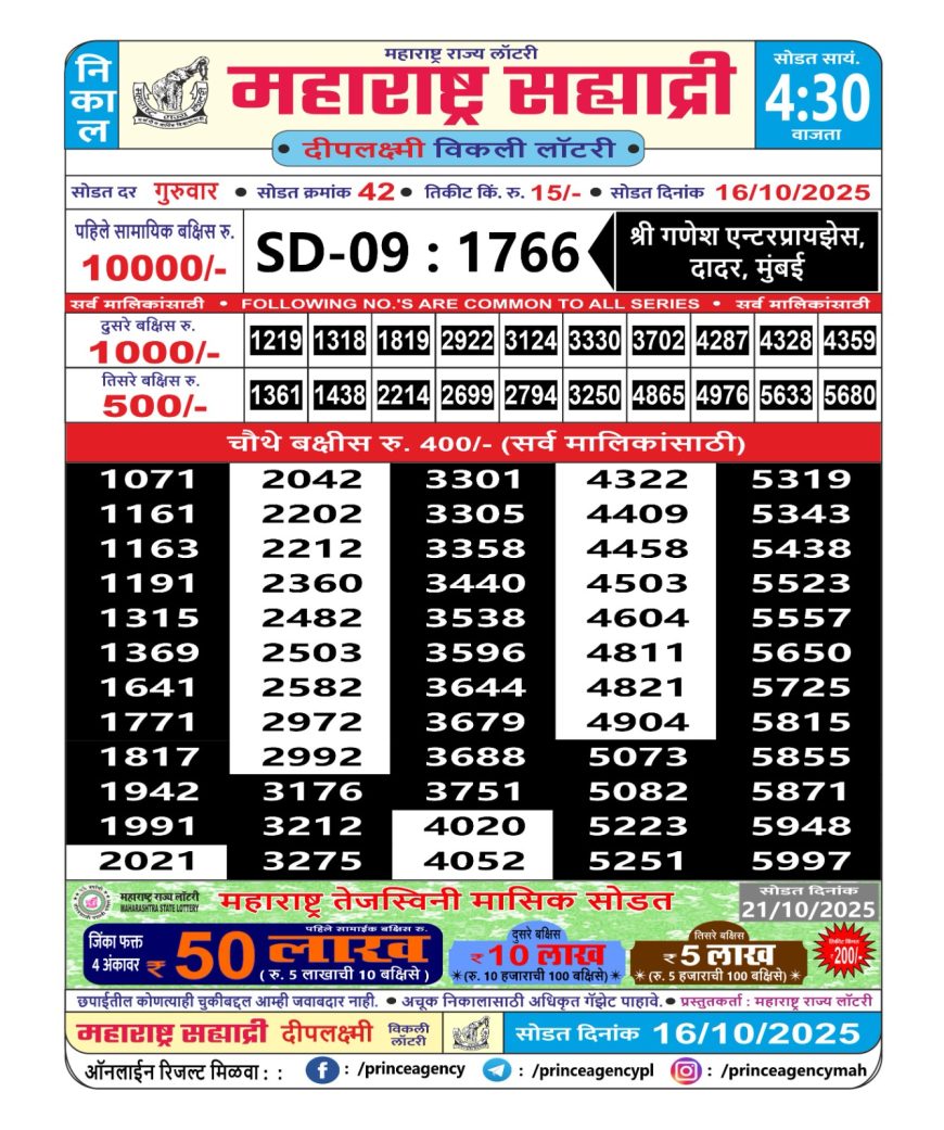 Maharashtra Sahyadri Weekly Lottery 4.30PM Result 16.10.2025