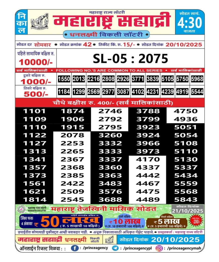 Maharashtra Sahyadri Weekly Lottery 4.30PM Result 20.10.2025