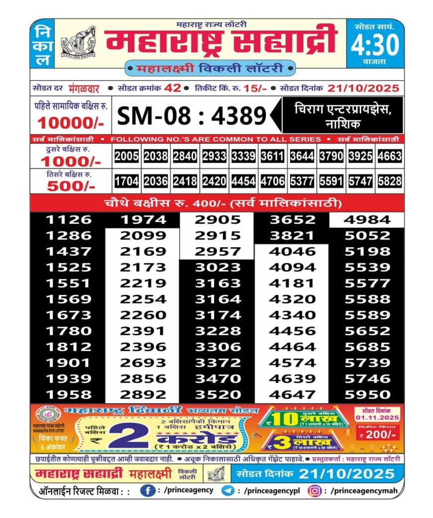 Maharashtra Sahyadri Weekly Lottery 4.30PM Result 21.10.2025