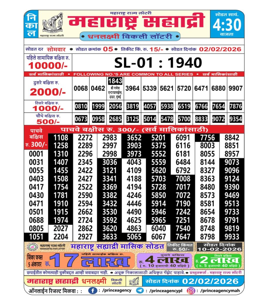 Maharashtra Sahyadri Weekly Lottery Result 02.02.2026 February 2, 2026 Leave a comment Related Results Rajshree Daily Lottery 8 PM Result 08.05.2025 Rajshree Night Lottery 9pm Result 04.12.2025 Rajshree 30 Weekly Lottery 8:30PM Result 31.07.2025