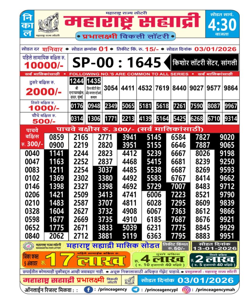 Maharashtra Sahyadri Weekly Lottery Result 03.01.2026