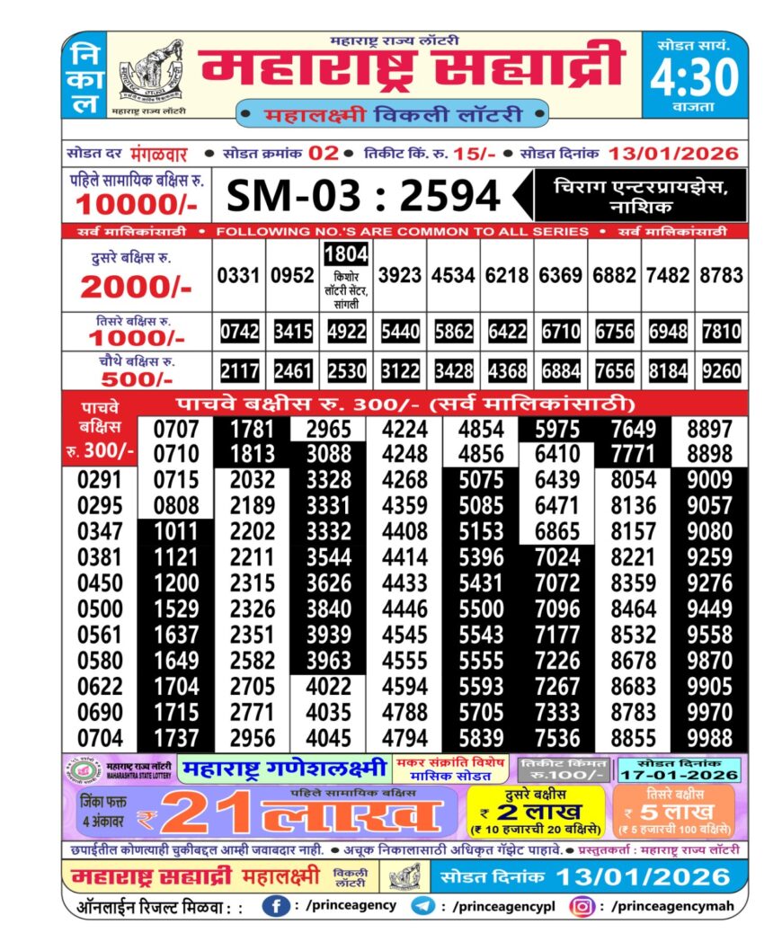 Maharashtra Sahyadri Weekly Lottery Result 13.01.2026