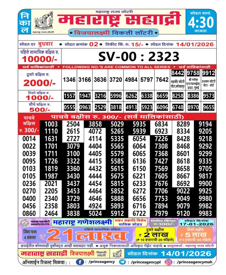 Maharashtra Sahyadri Weekly Lottery Result 14.01.2026