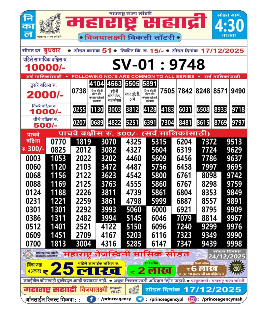 Maharashtra Sahyadri Weekly Lottery Result 17.12.2025 December 17, 2025 Leave a comment Related Results Maharashtra Sahyadri Weekly Lottery 4.30PM Result 01.08.2025 Rajshree 10 Daily Lottery 5.40 PM Result 04.07.2025 Maharashtra Gajlaxmi Weekly Lottery 4.45PM Result 06.08.2025