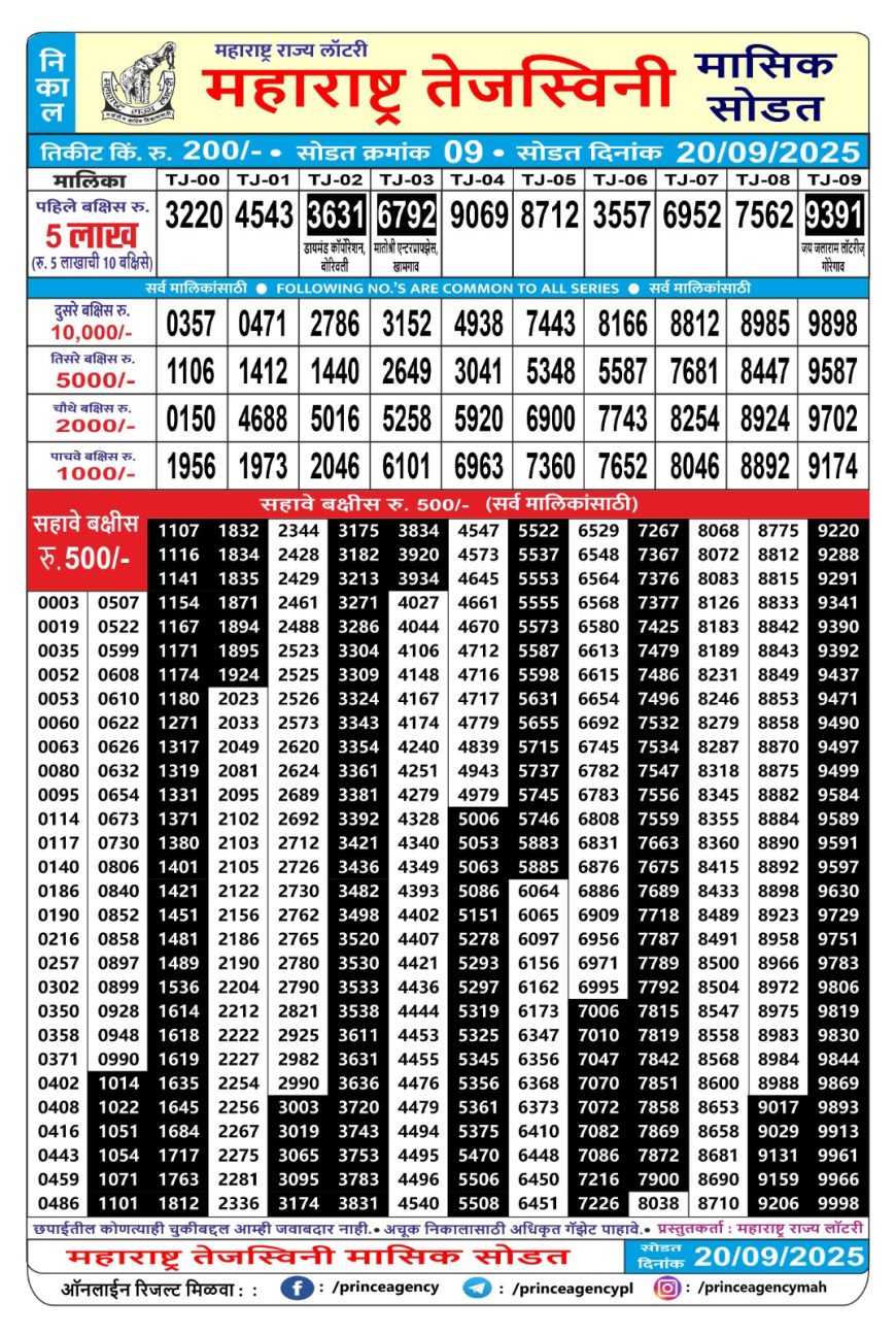Maharashtra Tejaswini Monthly Lottery Result 20/09/2025