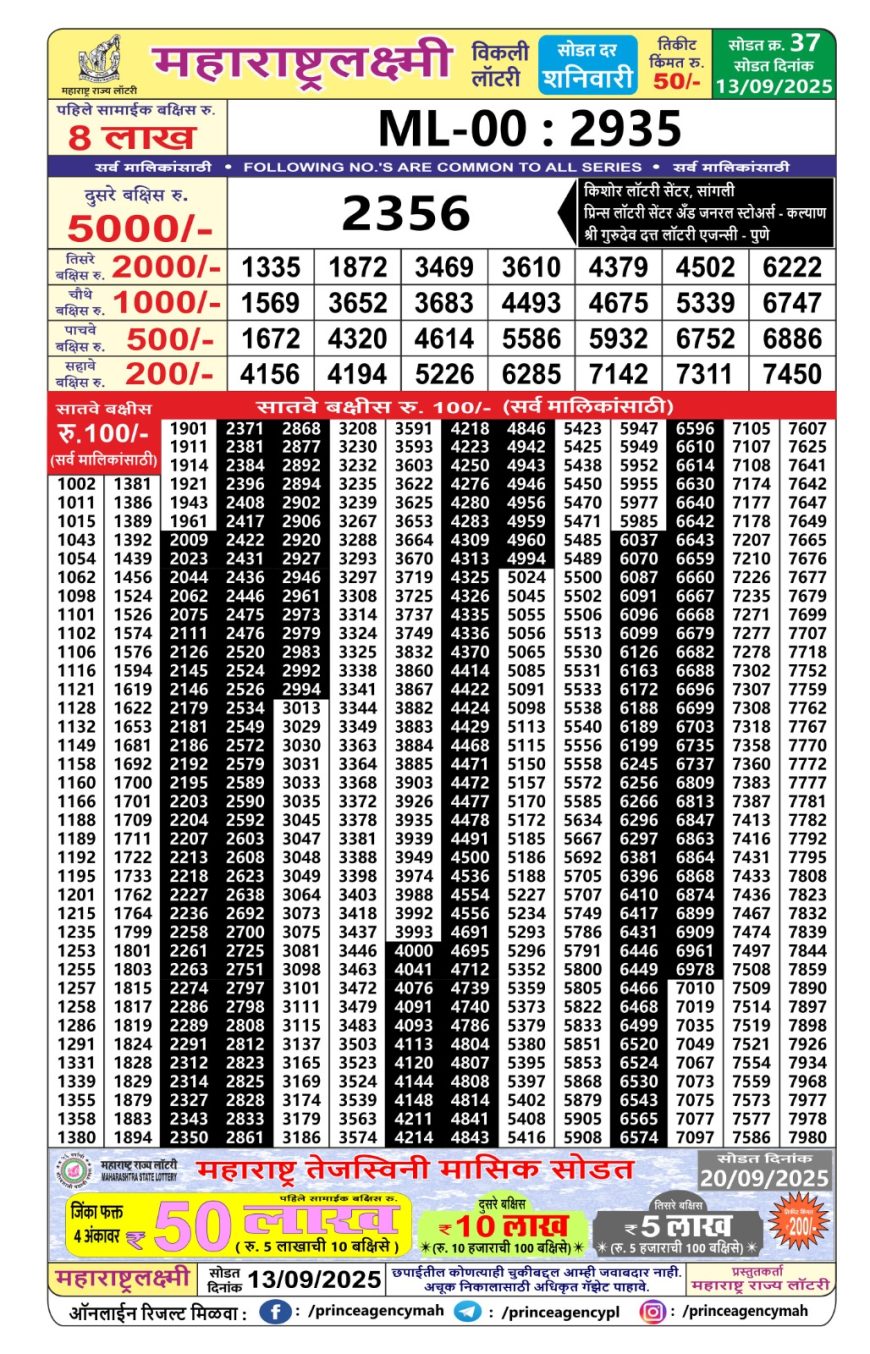 Maharashtra Weekly Lottery 4.15PM Result 13.09.2025 September 13, 2025 Leave a comment Related Results Maharashtra Gajlaxmi Weekly Lottery 4.45PM Result 17.08.2025 Dear 100 Daily Lottery 5 Pm Result 15.05.2025 Rajshree Daily Lottery 1PM Result 13.09.2025