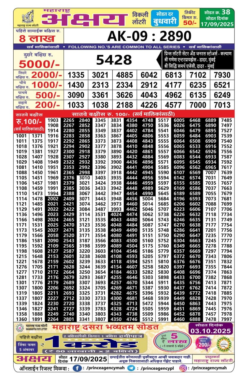 Maharashtra Weekly Lottery 4.15PM Result 17.09.2025 September 17, 2025 Leave a comment Related Results Dear 10 Daily Lottery 7 Pm Result 17.05.2025 Rajshree 50 Weekly Lottery 7:30PM Result 06.08.2025 Rajshree Weekly Lottery 9 PM Result 10.10.2025
