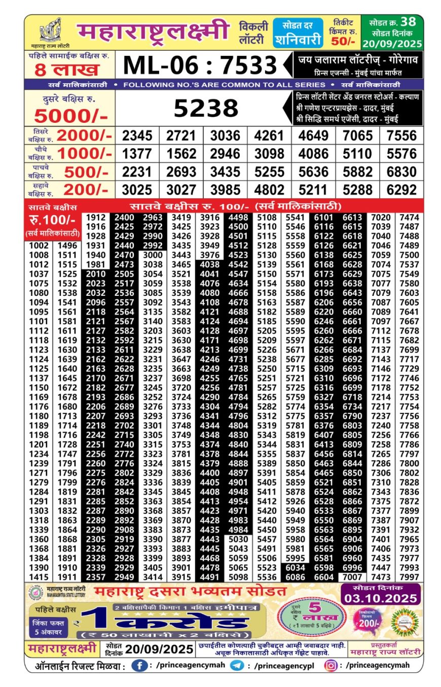 Maharashtra Weekly Lottery 4.15PM Result 20.09.2025 September 20, 2025 Leave a comment Related Results Rajshree Daily Lottery 1PM Result 21.09.2025 Maharashtra Ganeshlaxmi Weekly Lottery 5 Pm Result 20.06.2025 Maharashtra Ganeshlaxmi Weekly Lottery 5PM Result 30.08.2025