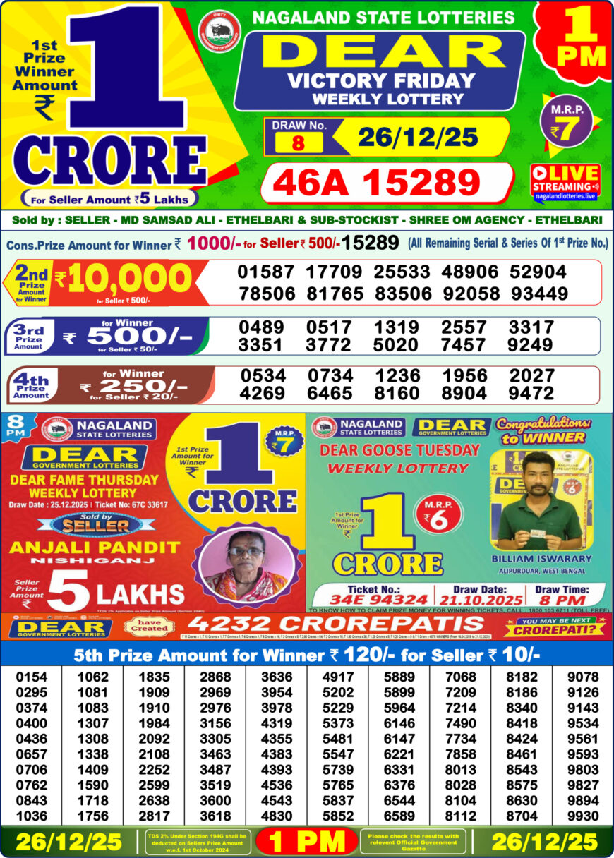 Nagaland State Dear Lottery 1PM Result 26.12.2025