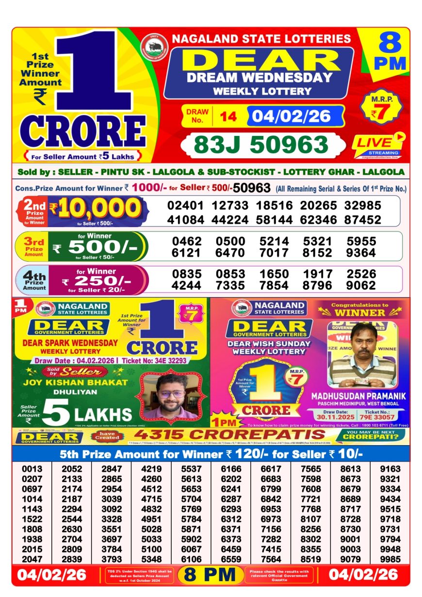 Nagaland State Dear Lottery 8PM Result 04.02.2026 February 4, 2026 Leave a comment Related Results Maharashtra Gajlaxmi Weekly Lottery 4.45PM Result 01.10.2025 Maharashtra Gajlaxmi Weekly Lottery 4.45PM Result 25.11.2025 Rajshree Daily Lottery 8 Pm Result 22.05.2025