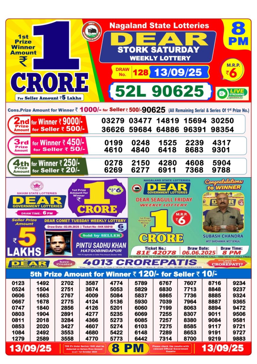 Nagaland State Dear Lottery 8PM Result 13.09.2025 September 13, 2025 Leave a comment 13 September 2025 8pm – Nagaland state lotteries Dear Lottery 8pm Result has been declared for 13/09/2025 . First prize rupees 1 crore Winning Ticket 52L 90625 went unsold today .Rest of the result is published here for your reference. Related Results Golden Star Lottery 9PM Result 17.10.2025 Rajshree 30 Daily Lottery 8.30 Pm Result 14.06.2025 Dear Daily Lottery 8 Pm Result 15.05.2025