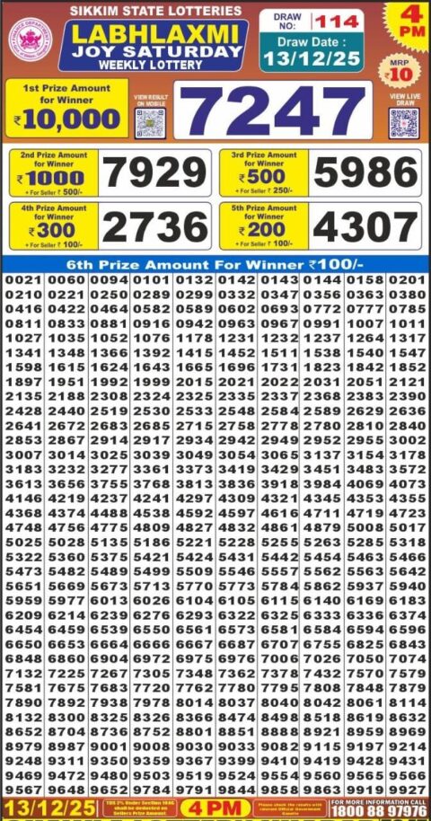 Sikkim State Dear Lottery 6PM Result 13.12.2025