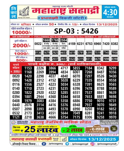 Maharashtra Sahyadri Monthly Lottery Result 13.12.2025