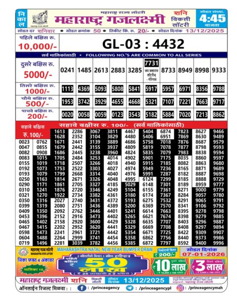 Maharashtra Gajlaxmi Weekly Lottery 4.45PM Result 14.12.2025