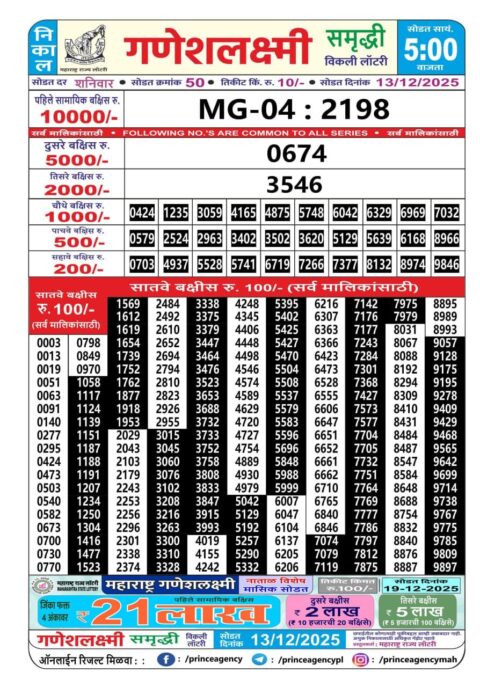 Maharashtra Ganeshlaxmi Weekly Lottery 5PM Result 13.12.2025