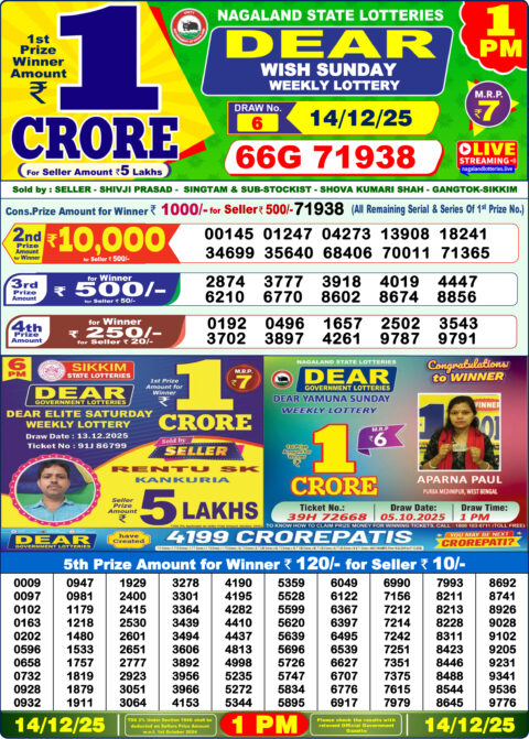 Nagaland State Dear Lottery 1PM Result 14.12.2025