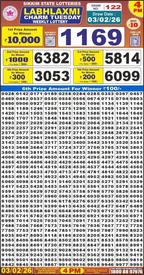 Sikkim State Dear Lottery 6PM Result 03.02.2026