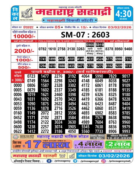 Maharashtra Sahyadri Weekly Lottery Result 03.02.2026