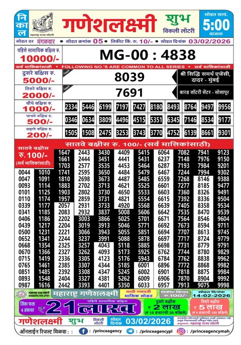 Maharashtra Ganeshlaxmi Weekly Lottery Result 03.02.2026