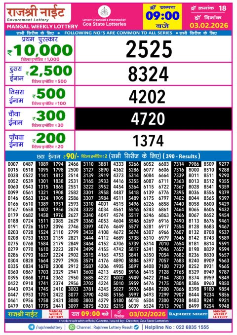 Rajshree Night Lottery 9pm Result 03.02.2026