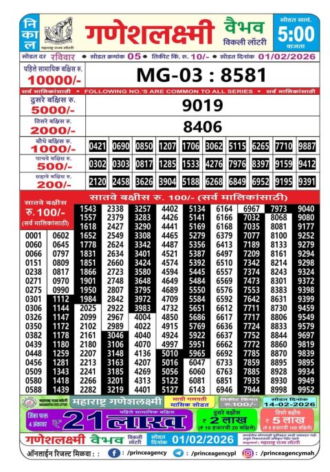 Maharashtra Ganeshlaxmi Weekly Lottery Result 01.02.2026