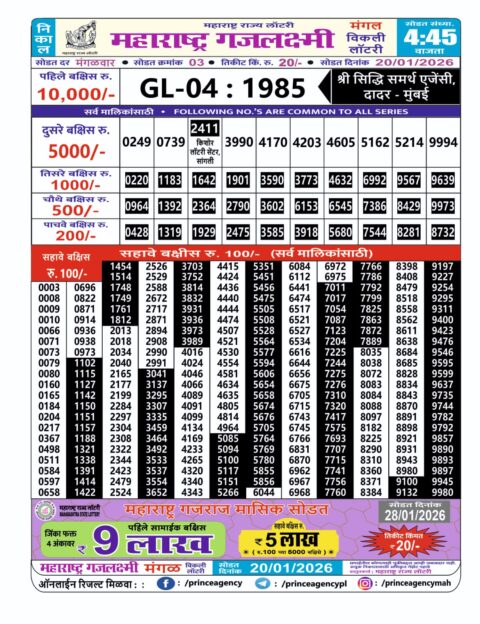 Maharashtra Gajlaxmi Weekly Lottery Result 20.01.2026