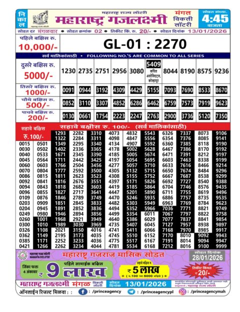 Maharashtra Gajlaxmi Lottery Result 13.01.2026