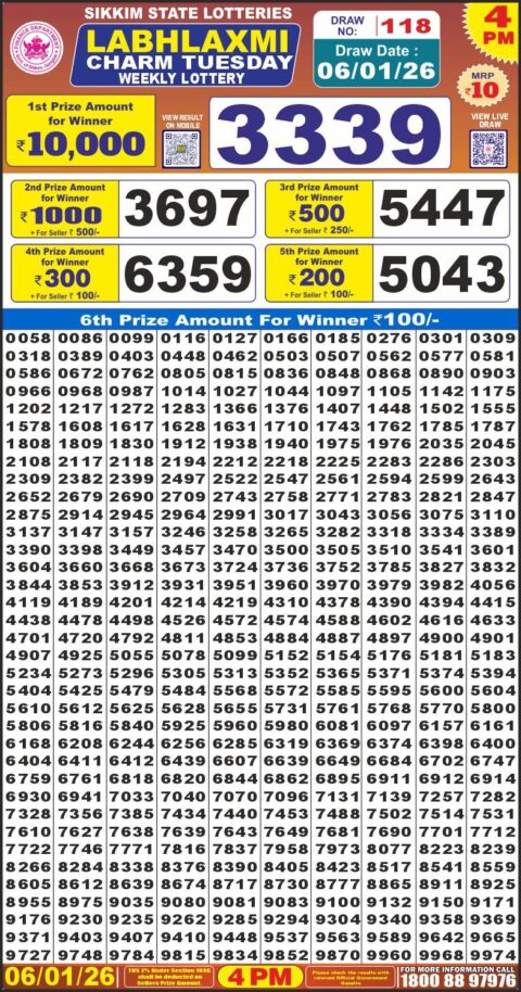 Sikkim State Dear Lottery 6PM Result 06.01.2026